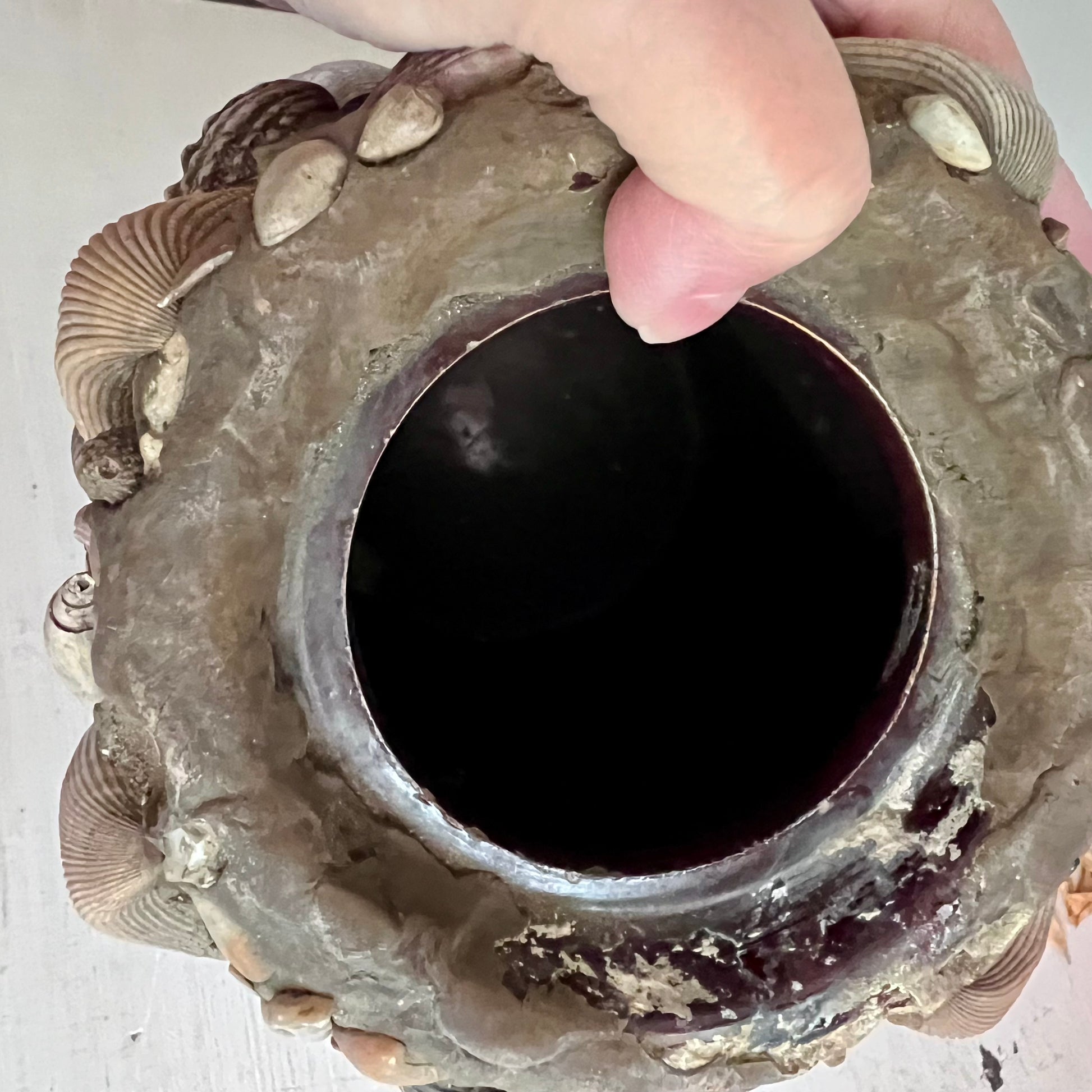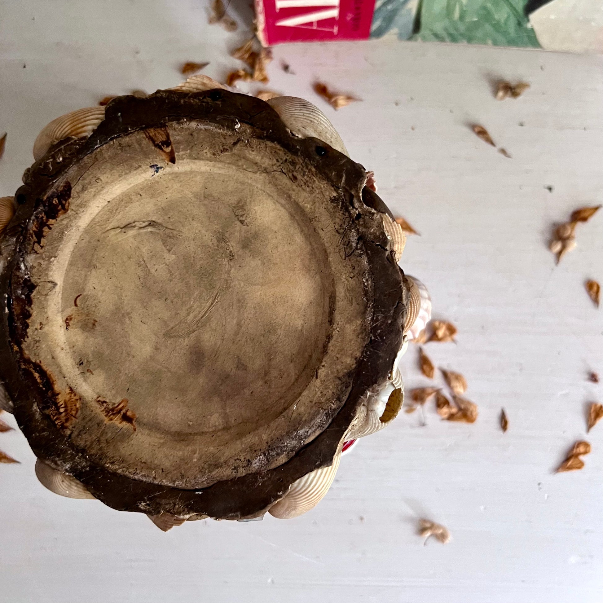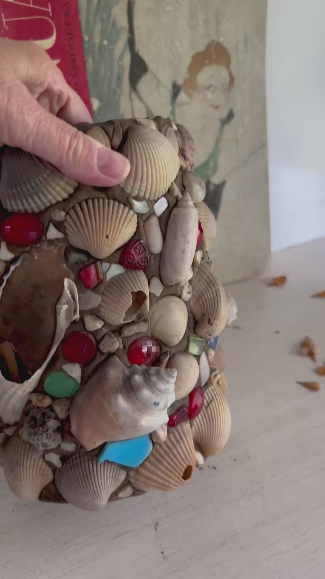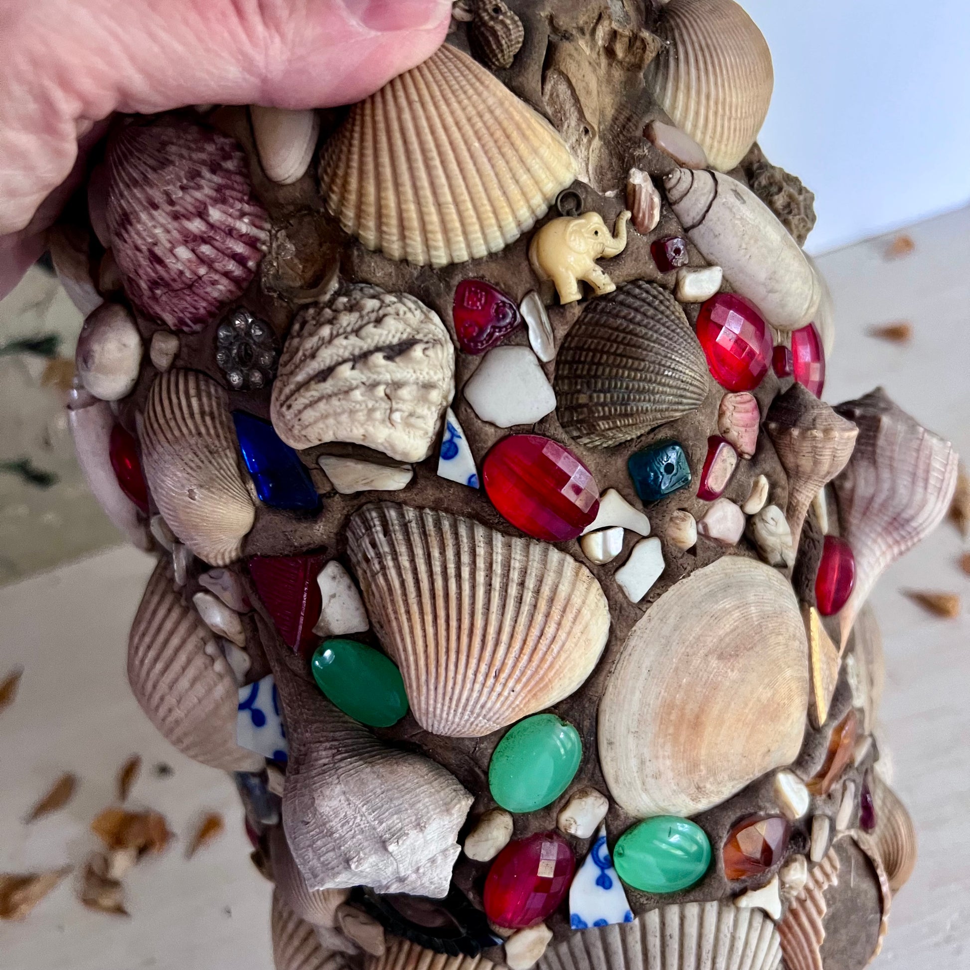 - Materials: stoneware crock, mortar, shells, stones, china pcs, jewelry, buttons, beads...