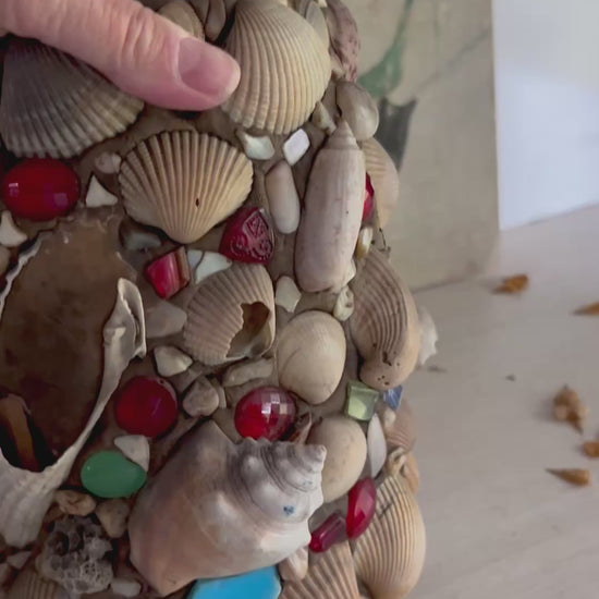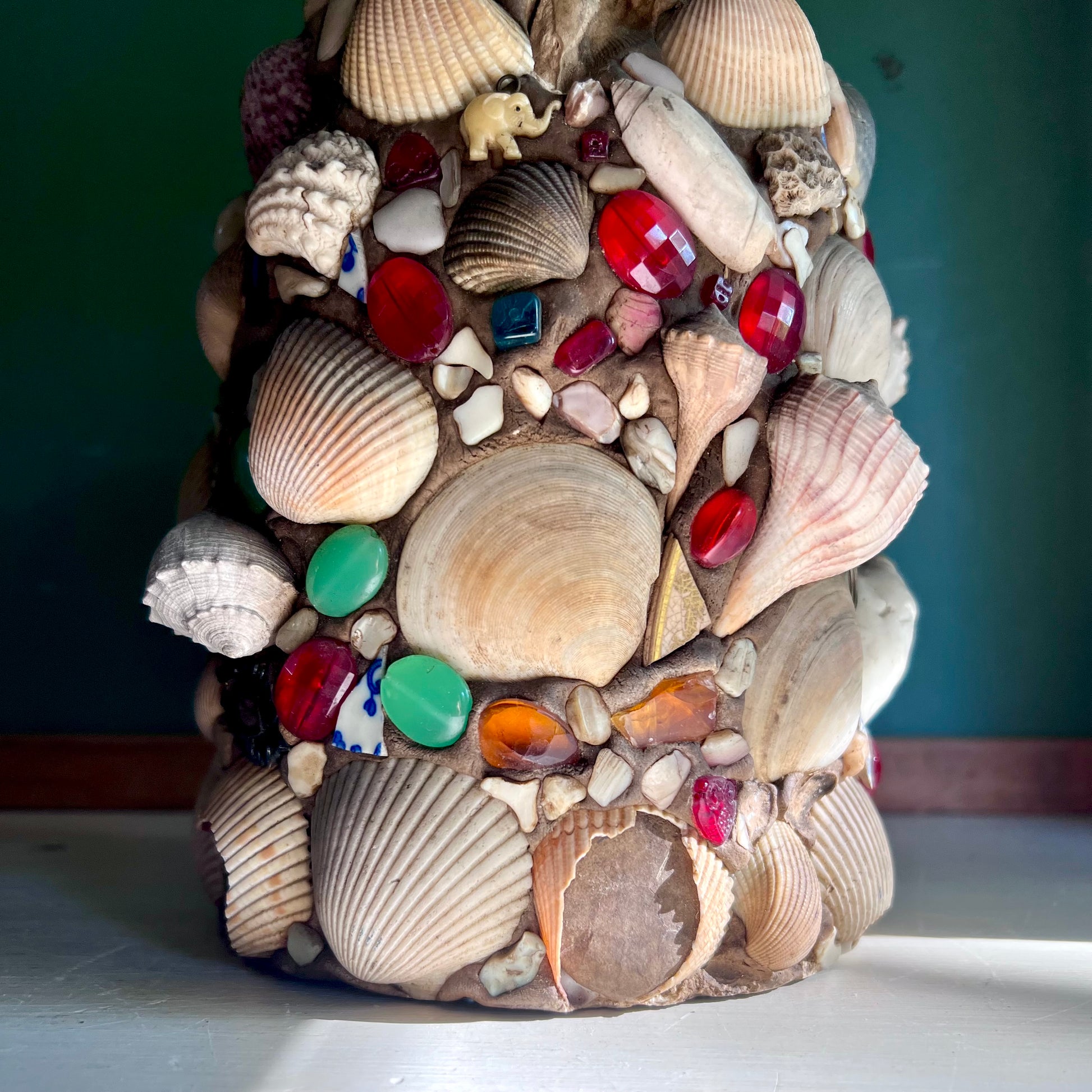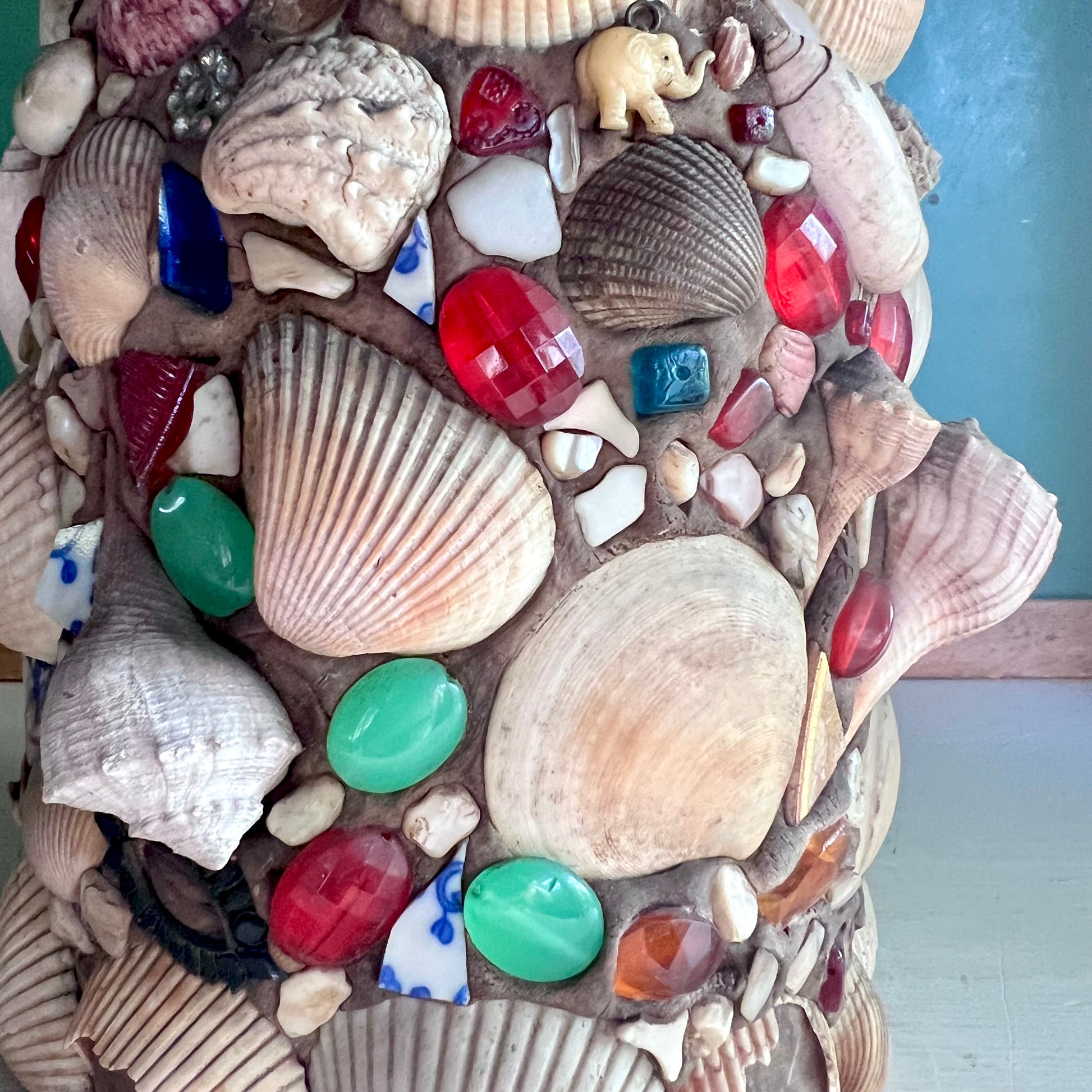 The story of folk art memory jugs goes back maaaany years. This old girl - with shells and baubles and pocket trinkets - may be from the south where shells were easily accessible year 'round.