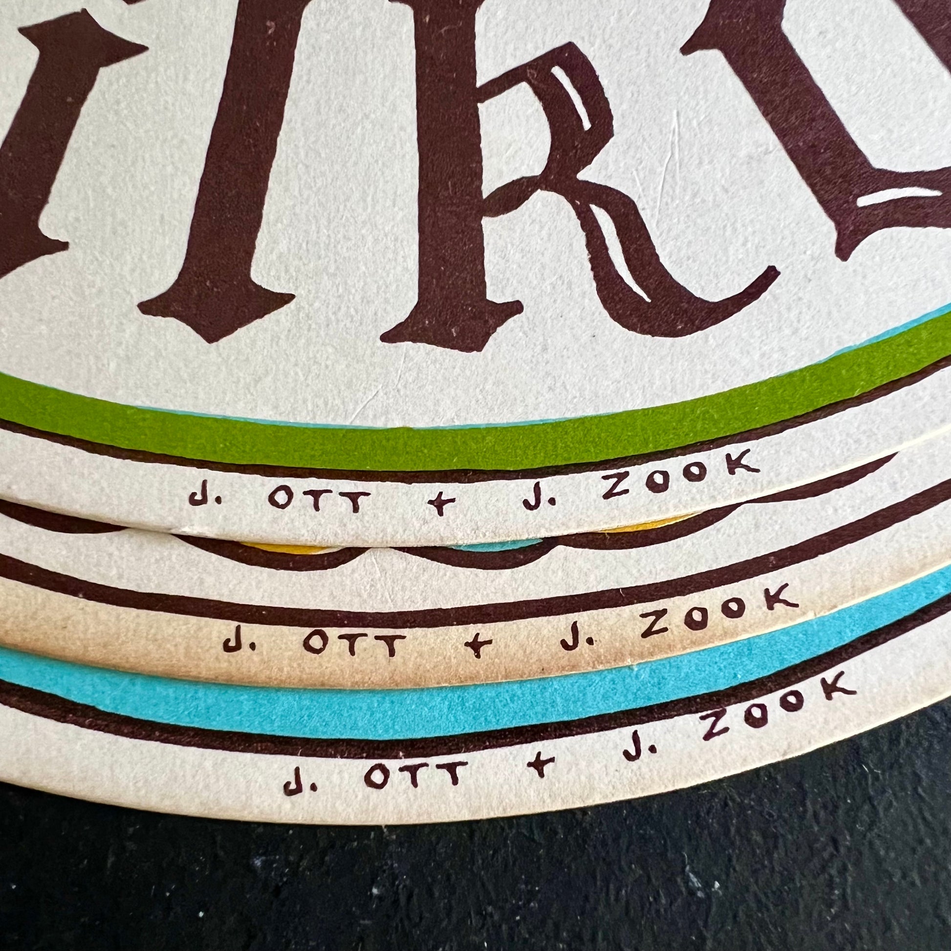 Good vintage condition. Mild edge wear consistent with age. Several disks have discoloration to edges and back. Colors bright. Signed J. Ott + J Zook. Undated but these were sold in the 1950's.