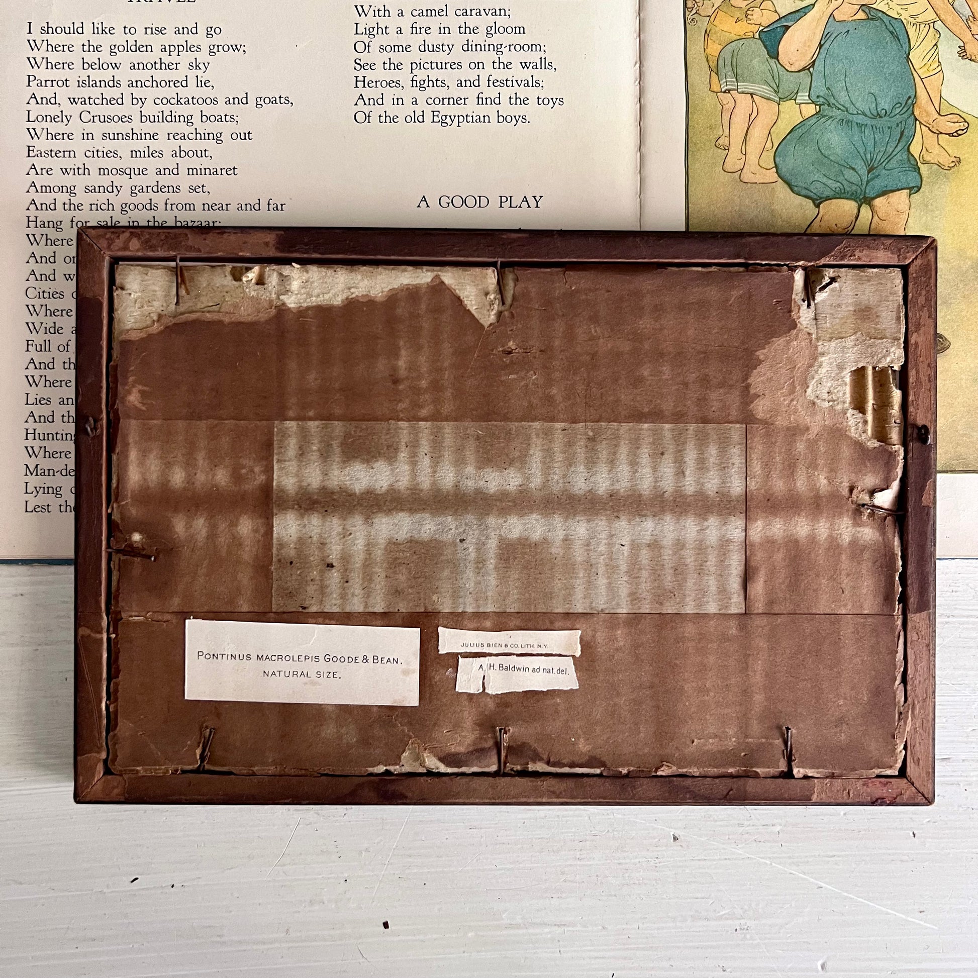Very good condition with colors bright and details sharp. Set in black and silver vintage wooden frame with type of fish adhered to frame backing. Pulled from salvaged 1899 book ‘Investigations of the Aquatic Resources and Fisheries of Porto Rico.’