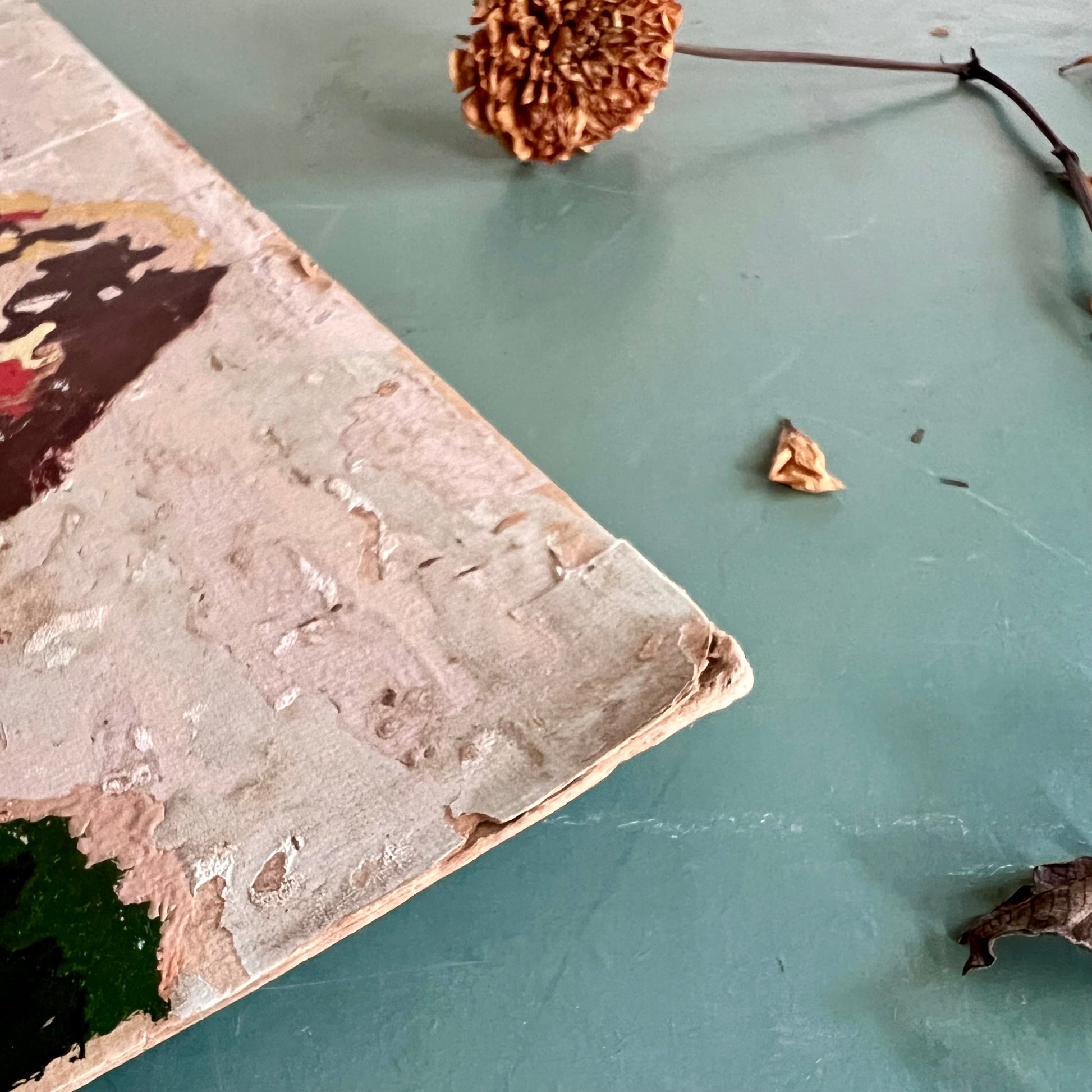 Fair vintage condition with makes THIS one extra charming! Faded and worn throughout, this old girl has the BEST fall colors. Painted surface shows wear as do the corners. Slight water damage on back side. Unframed. Dated to 1954.