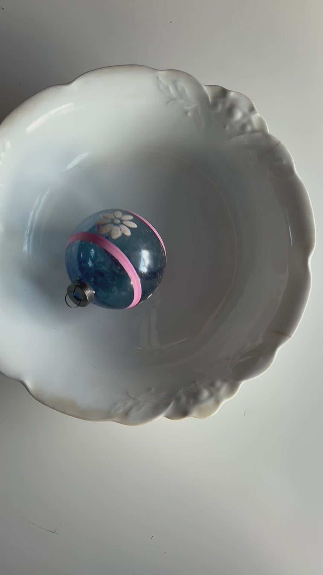 These WWII unsilvered ornaments are becoming harder to find, so when we see one out in the wild, we snatch it up. This beautiful Shiny Brite ornament was sitting in a junk box at a local flea market. So clear and pretty, she came home with us. Now she’s waiting for a new home.